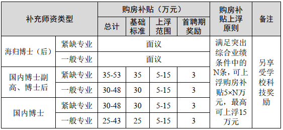 补充说明: 首聘期内获批省部级及以上人才项目,达到领军人才级别的海内外博士,可兑现购房补贴差额。