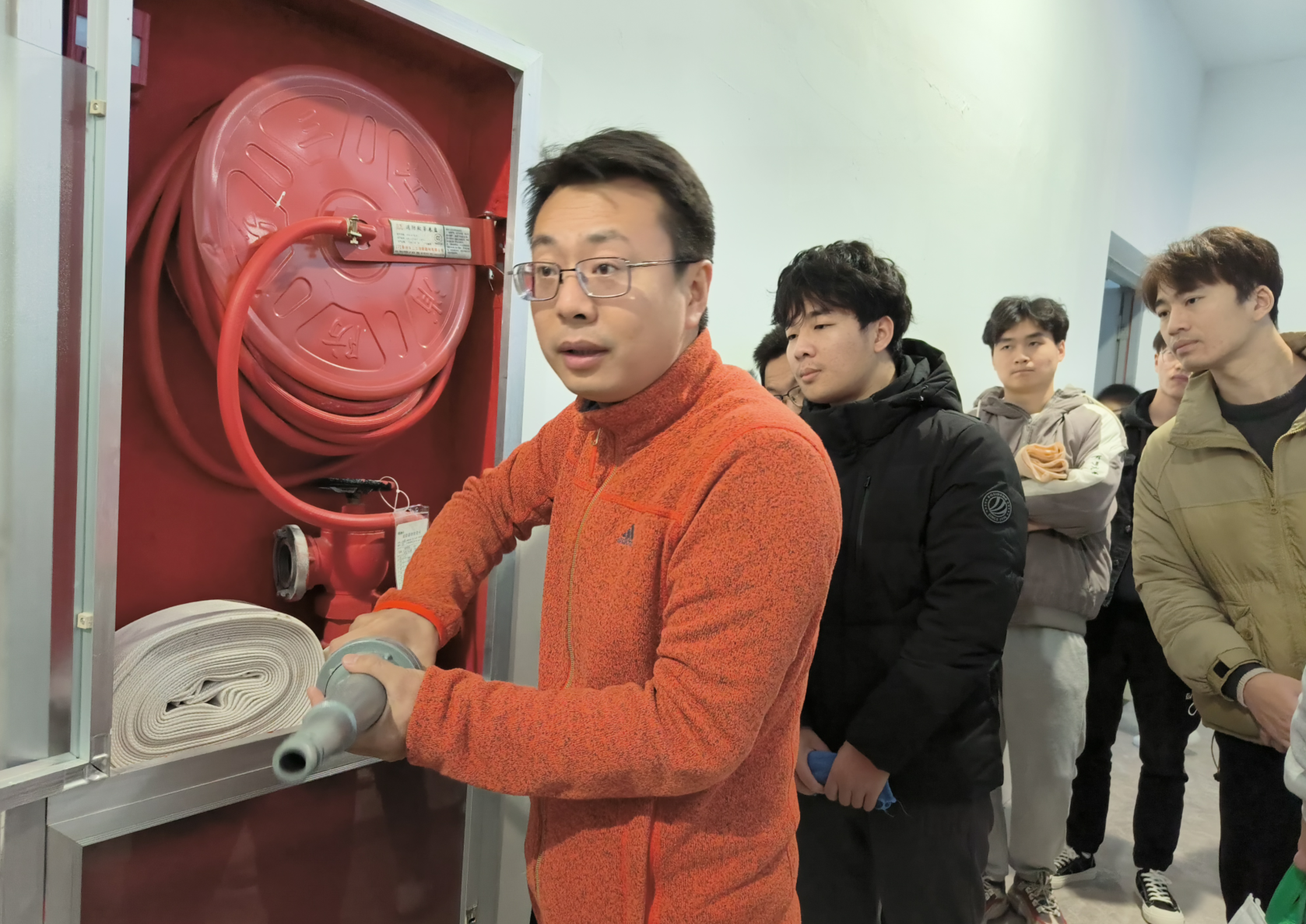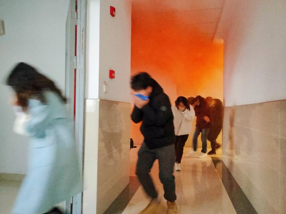 演习开始前,保卫处赵强老师向参与演习的老师同学讲解基本消防知识、消火栓的正确操作方法,并介绍演习具体方案。随着实验室三楼某设备间突然着火,走廊天井处涌出滚滚浓烟,警报声响起,消防疏散灭火演练拉开序幕。同学们在疏散指导员的组织下,捂住口鼻、快速有序地从实验室向安全地带疏散。整个疏散演练过程紧凑有序,达到了预期的效果。接着,在机械公司楼西侧空地,师生代表在专业人员的指导下进行灭火实操演练,每位同学按照灭火器规范操作流程,进行了灭火操作。最后,保卫处及公司领导对本次演习进行总结,对演习过程中存在的安全问题进行了反馈并提出进一步要求,希望通过本次演习,能够使同学们增长安全意识,掌握基本逃生技能,为创建平安校园贡献力量!