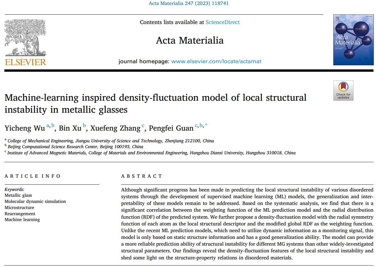 近日,太阳集团tyc33455官网青年教师吴义成与北京计算科学研究中心团队合作,以“Machine-learning inspired density-fluctuation model of local structural instability in metallic glasses”为题在一区Top期刊《Acta Materialia》上发表论文。吴义成博士为论文第一作者,北京计算科学研究中心的管鹏飞教授为论文通讯作者,太阳集团tyc33455官网为论文第一署名单位。《Acta Materialia》是金属领域国际顶尖期刊。