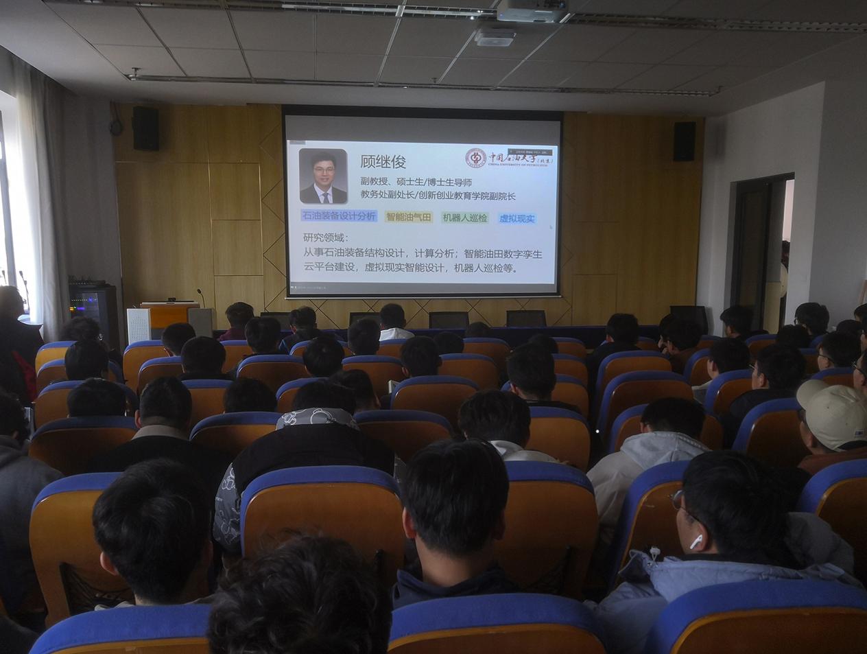 顾继俊副教授首先介绍了海洋石油开发当中用到的一些装备及平台形式,并针对适合于深水的平台与立管系统进行了详细背景介绍。接着,顾继俊副教授对深水立管系统受到的复杂载荷进行了分析,让师生们深入了解到深水立管系统所处的海洋工况及面临的难题。然后,顾继俊副教授结合团队近几年的研究成果,深入介绍了基于最小势能原理的多种构型深水立管(SCR、缓波形、陡波形及自由站立式等)的整体控制数值模型分析方法,以及基于共旋坐标法的深水立管有限元模型分析方法,以此解决大长细比立管在复杂载荷耦合作用下的大位移小应变问题,阐明触地段与非线性海床的相互作用机理以及扭转失稳机理。最后,顾继俊副教授对未来工作进行了展望,认为相应数值模型的成功应用可加速具有自主产权的国产化软件开发,从而保障我国海洋油气开发中的管线安全运行,具有重要的工程和战略意义。会上,顾继俊副教授生动而精彩的讲课,获得了师生们的阵阵掌声。