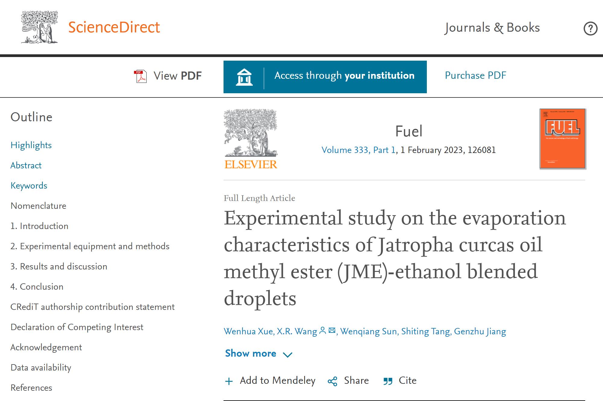 以“Experimental study on the evaporation characteristics of Jatropha curcas oil methyl ester (JME)-ethanol blended droplets”为题的原创性研究成果在《Fuel》上公开发表,公司太阳集团tyc33455官网在读硕士研究生薛文华为第一作者、导师王筱蓉教授为第二作者、通讯作者。