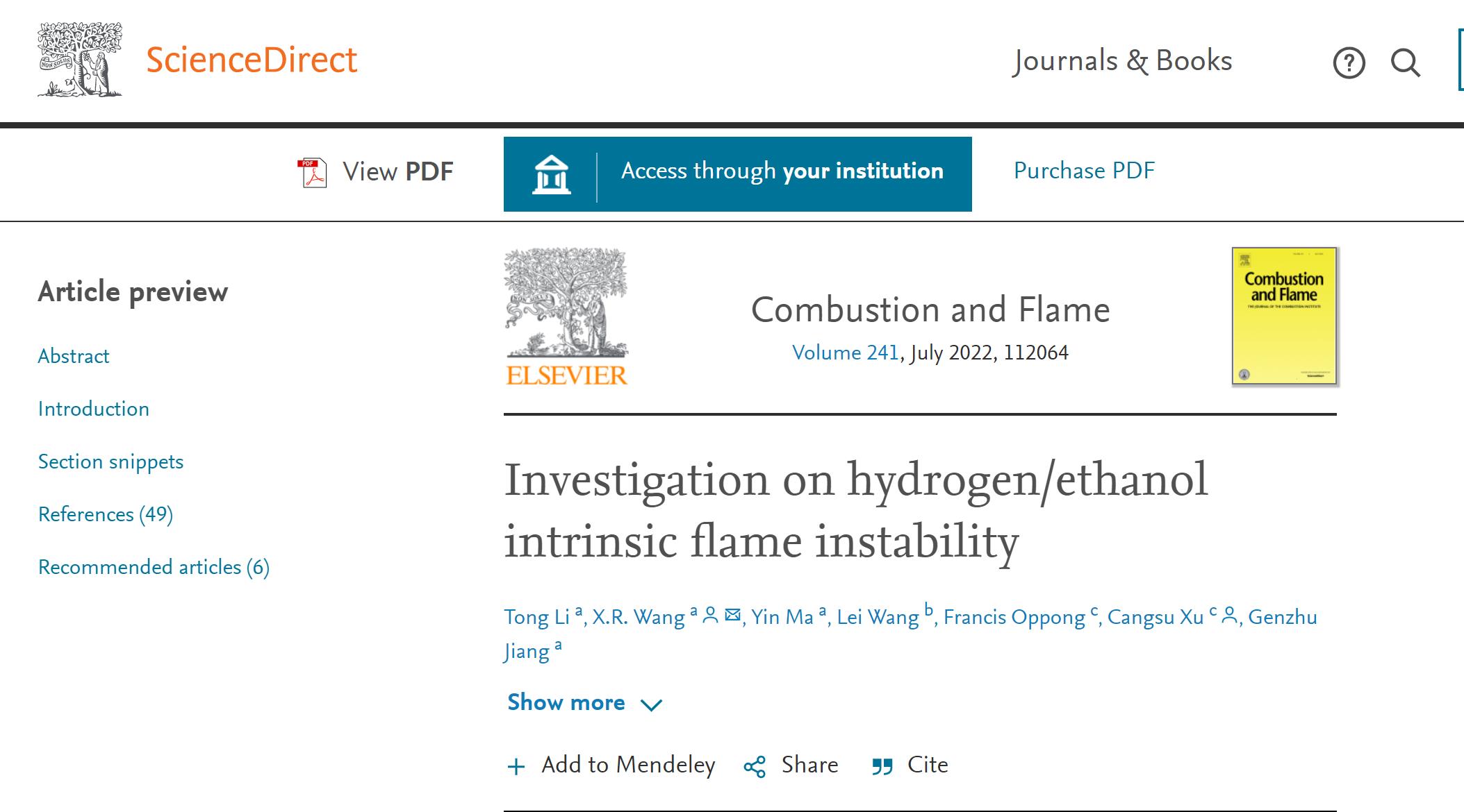 其中,与浙江大学合作,相关成果以题为“Investigation on hydrogen/ethanol intrinsic flame instability”的论文在《Combustion and Flame》上公开发表,该原创性研究以太阳集团tyc33455官网硕士研究生李童为第一作者,在导师王筱蓉教授、浙江大学能源工程公司许沧粟副教授和浙江大学博士后Francis Oppong的共同指导下完成。