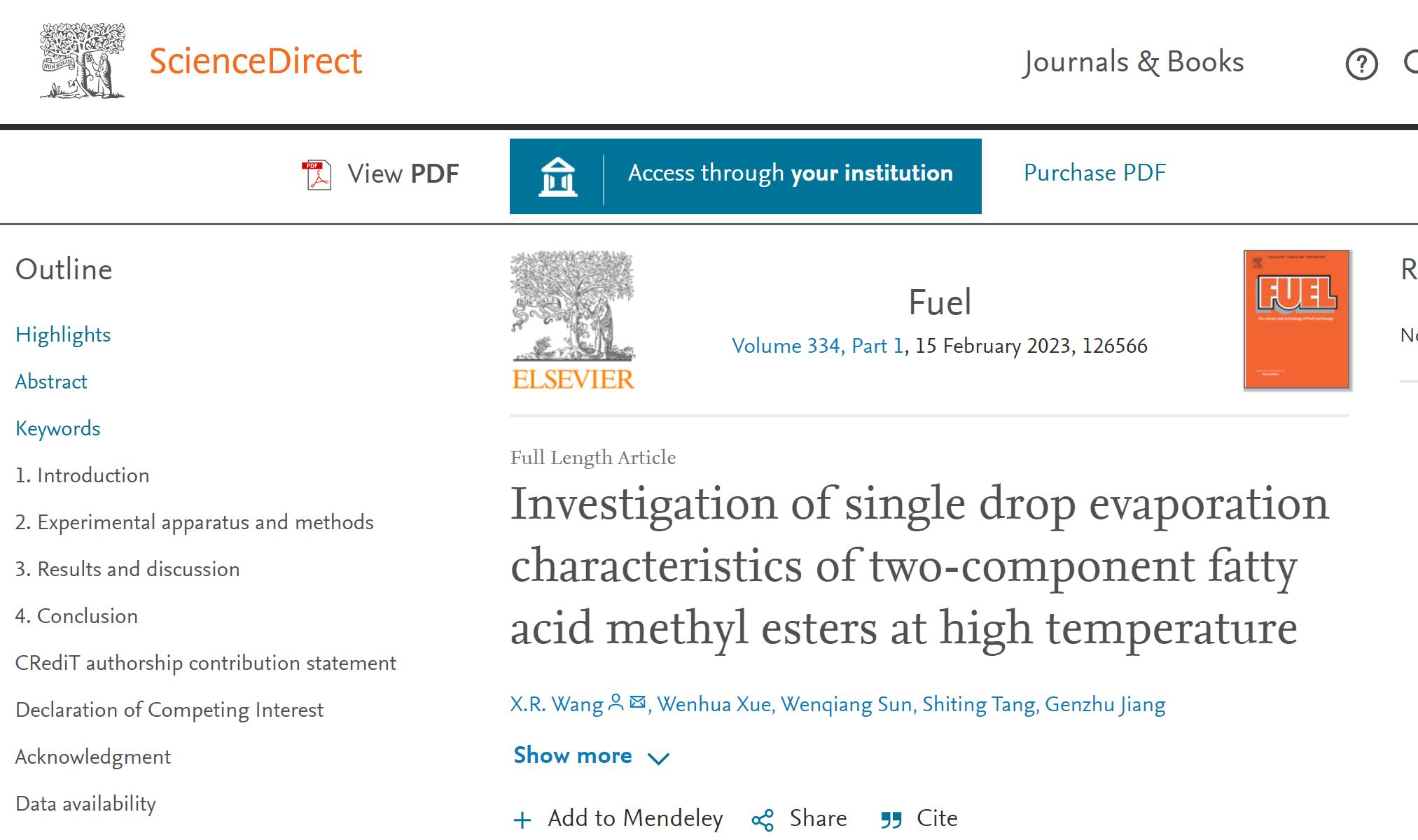 以“Investigation of single drop evaporation characteristics of two-component fatty acid methyl esters at high temperature”为题的原创性研究成果在《Fuel》上公开发表,公司太阳集团tyc33455官网在读硕士研究生薛文华为第二作者、导师王筱蓉教授为第一作者、通讯作者。