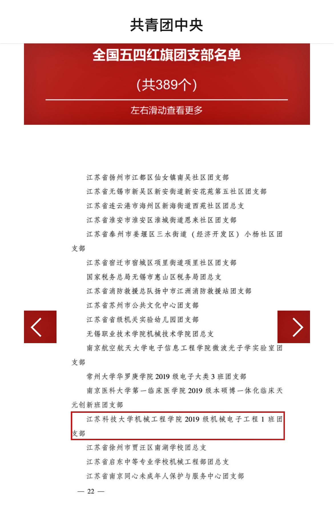 据悉,全国“两红两优”评选是共青团中央授予基层团组织的最高荣誉,这是公司基层团组织首次获此殊荣。近年来,在公司党委和上级团组织的坚强领导下,1922102021团支部自成立以来,一直秉承“立青春潮头,做有为青年”的理念,以“听党话跟党走”的理想信念教育为中心,以机械电子工程专业学习为根本,以“小我融入大我”突显时代使命的实践活动为载体,着力提高团支部成员政治素质、专业素质和身心素质,扎实推进团支部凝聚力、引领力和服务力。团支部先后荣获江苏省“先进班集体”、镇江市“五四红旗团支部”、江苏省“社会实践优秀团队”、镇江市社会实践“优秀团队”等荣誉称号。
