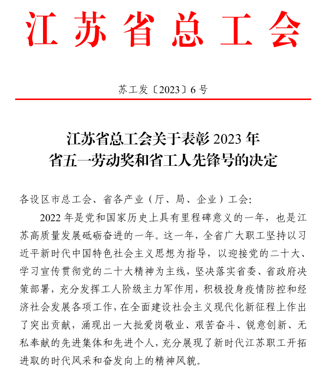 4月27日,江苏省总工会下发《关于表彰2023年省五一劳动奖和省工人先锋号的决定》(苏工发﹝2023﹞6号)文件,对过去一年爱岗敬业、艰苦奋斗、锐意创新、无私奉献的先进集体和先进个人进行表彰。公司太阳集团tyc33455官网被评为“江苏省工人先锋号”。