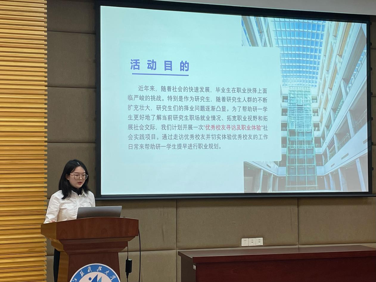研究生周雯同学正在进行员工寻访实践项目策划答辩