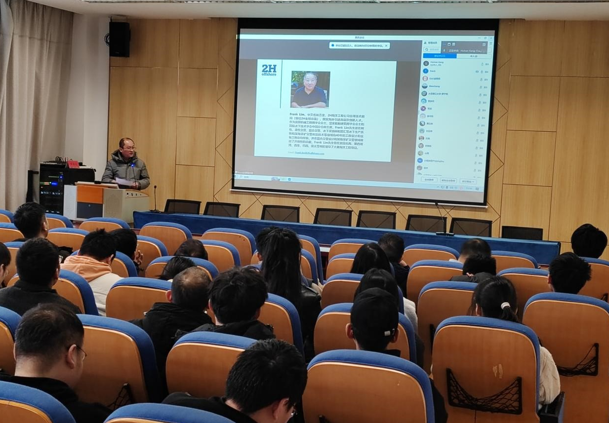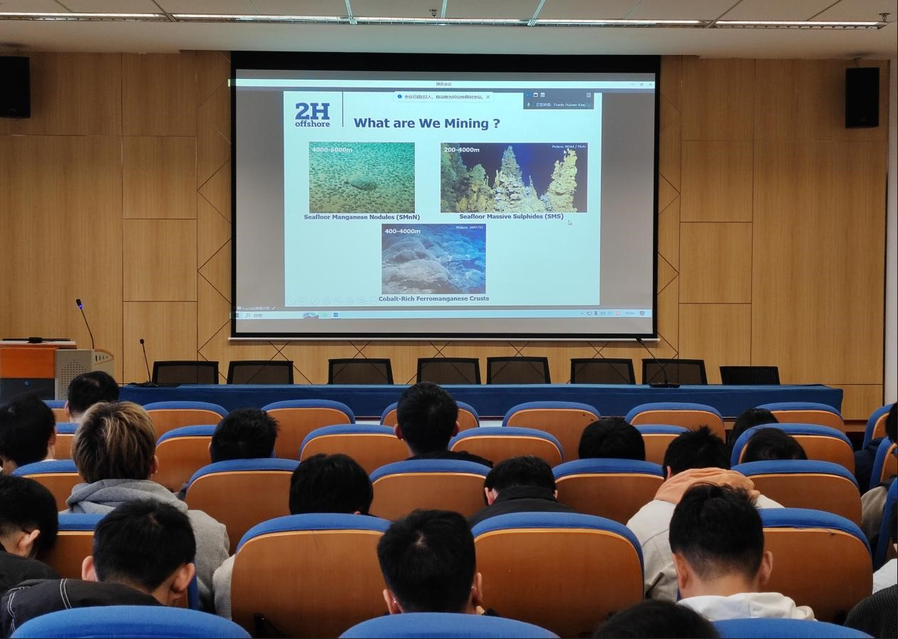 Frank Lim教授首先介绍了深海采矿技术的应用背景及研究现状,并以印度尼西亚附近采矿所面临的环境挑战为例阐述了深海采矿技术面临的问题和难题,详细讲解了不同国家划分采矿区块的方式以及采矿原理,并对当前使用的采矿设备(母船、立管、混输系统、泵等)及系统进行详细解析、说明;特别是母船不同部分的功能和设计原理,并指出了当前采矿母船和采矿船的运输方式存在的问题。在讲座的最后,Frank Lim教授总结了采矿技术成功所需的经验和关键技术,并展望了采矿技术未来可能的发展方向,鼓励师生们积极参与深海采矿技术的研究,为解决当前和未来的资源需求作出贡献。