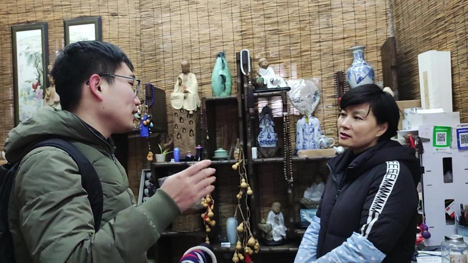 刘士鑫同学(左一)采访店铺老板 拍摄:鲍国强