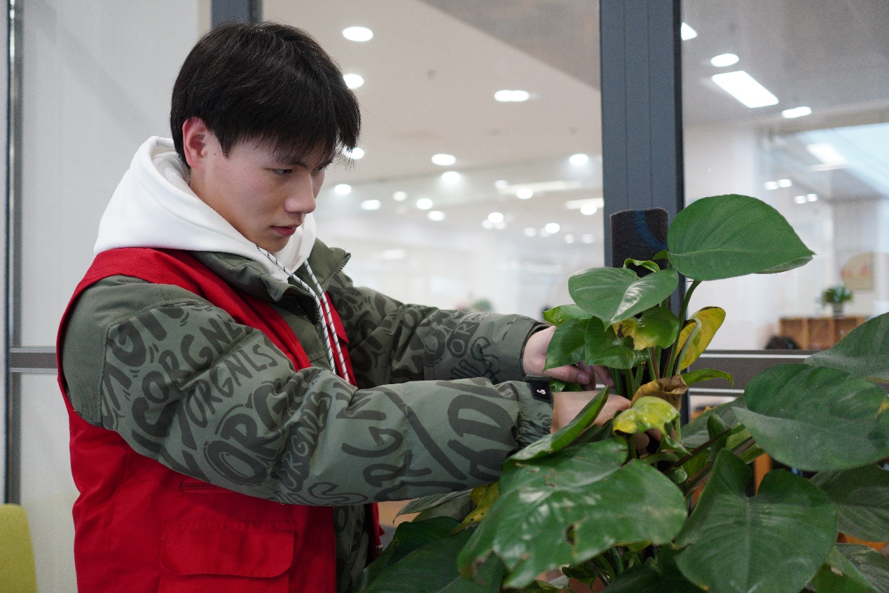 图为志愿者修剪盆栽枯叶。 马灿坤 摄