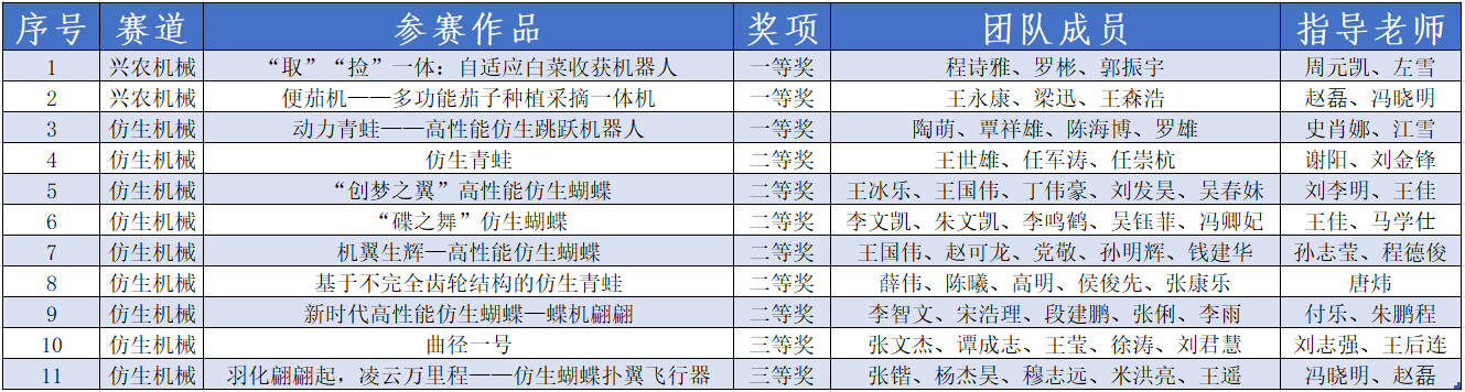 经过激烈的角逐,最终《“取”“捡”一体:自适应白菜收获机器人》《便茄机——多功能茄子种植采摘一体机》《动力青蛙——高性能仿生跳跃机器人》3个项目获一等奖;《“碟之舞”仿生蝴蝶》《“创梦之翼”高性能仿生蝴蝶》《机翼生辉—高性能仿生蝴蝶》《新时代高性能仿生蝴蝶—蝶机翩翩》《仿生青蛙》《基于不完全齿轮结构的仿生青蛙》6个项目获二等奖,《羽化翩翩起,凌云万里程——仿生蝴蝶扑翼飞行器》《曲径一号》2个项目获三等奖。