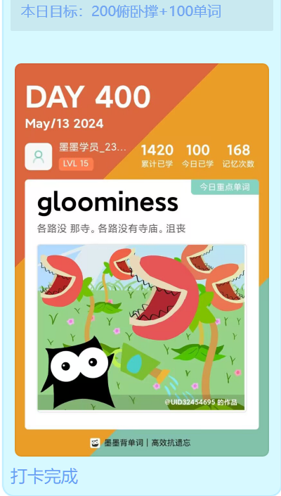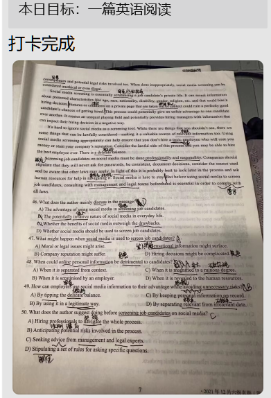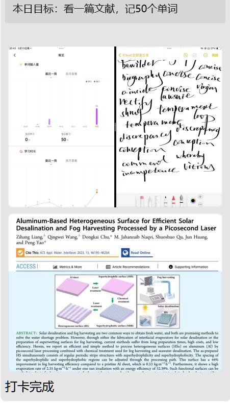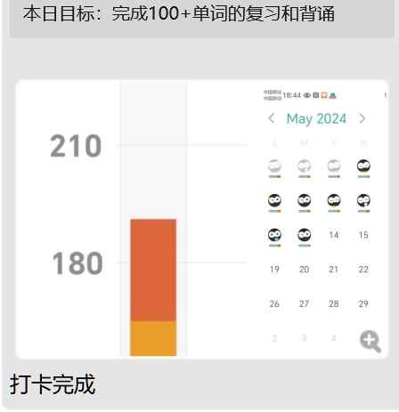 在活动启动的第一天,早就加入“打卡群”的同学们就已经按捺不住心中的热情,争先制定每日计划目标,“今日目标跑步四公里”、“今日目标学习100英语单词”、“今日看一篇高质量文献”...集团的体育馆,湖畔边,图书馆,都可以看到他们积极实现目标而努力拼搏的身影,“打卡群”内完成每日目标的信息也纷至沓来。