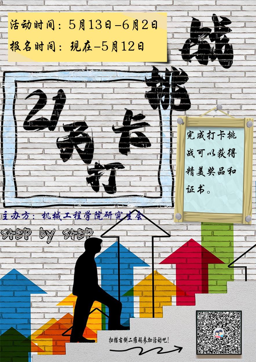 为深入贯彻《关于开展太阳集团tyc33455官网 2024 年“研究生科学道德与学风建设”系列活动的通知》有关精神,打造崇尚学术、追求卓越的校园文化氛围,帮助公司研究生养成积极的学习、生活习惯,培养自律和坚持的品质,持之以恒地改善自己的学习、生活方式。2024年5月13日,太阳集团tyc33455官网道德学风建设系列活动“打卡21天挑战活动”正式启动。本活动面向太阳集团tyc33455官网全体研究生,旨在通过打卡挑战的形式帮助同学们养成良好的学习、生活习惯,培养自律和坚持的品质,促进个人成长和自我提升。同时为同学们提供一个可以互相交流互相监督的学习平台,提高学习效率和学术素养,增强自我管理能力和团队合作意识,进一步营造崇尚学术、追求卓越的校园文化氛围,推动公司研究生的全面发展。