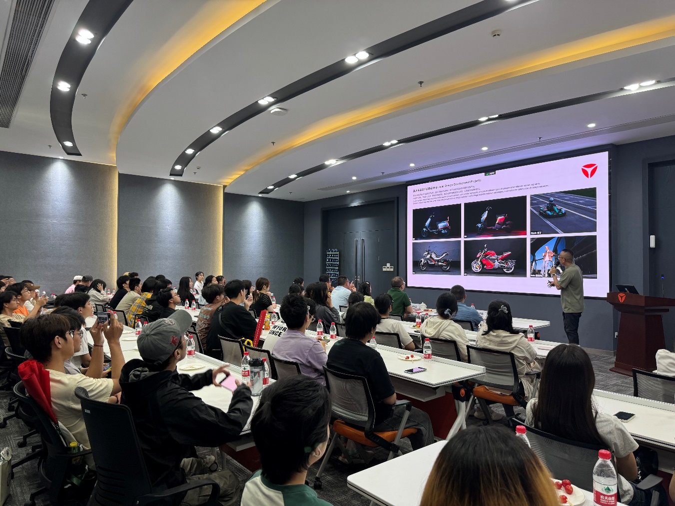 活动伊始,蔡陈樱女士向师生们全面而详细地介绍了雅迪集团自创立以来的辉煌发展历程、广泛的业务范围及充满无限潜力的市场前景。紧接着,莫家俊总监则从工业设计的专业角度出发,深刻阐述了雅迪工业设计团队的独特运行模式,以及工业设计在雅迪集团持续发展中所起到的举足轻重的作用。通过企业方的精彩讲解,师生们对雅迪集团的整体实力和工业设计的核心价值有了更为直观且深刻的理解。