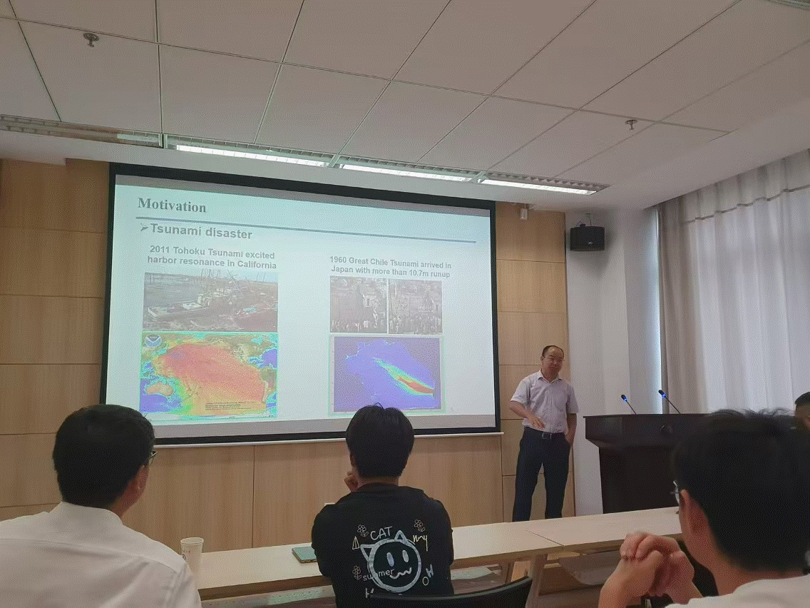 王岗教授以1960年智利大海啸和2011年日本海啸为例子,比较海啸波幅图引出海脊俘获波现象,详细阐述了针对该现象的解析理论推导过程,并通过数值模拟形象生动地展现了瞬态冲击波在海脊地形上的传播变形过程,证实了解析解的准确性。