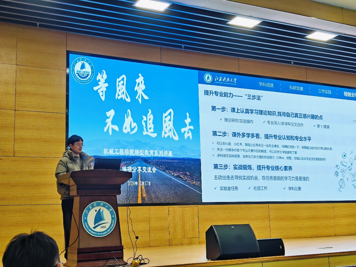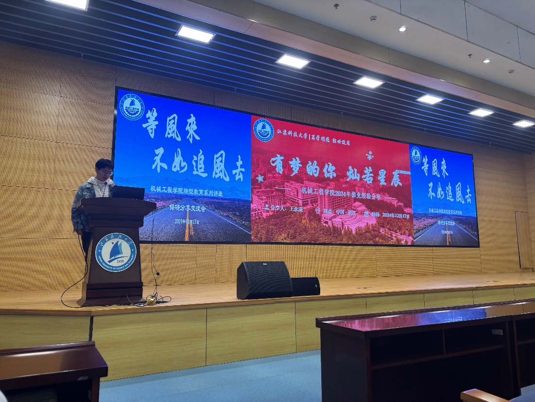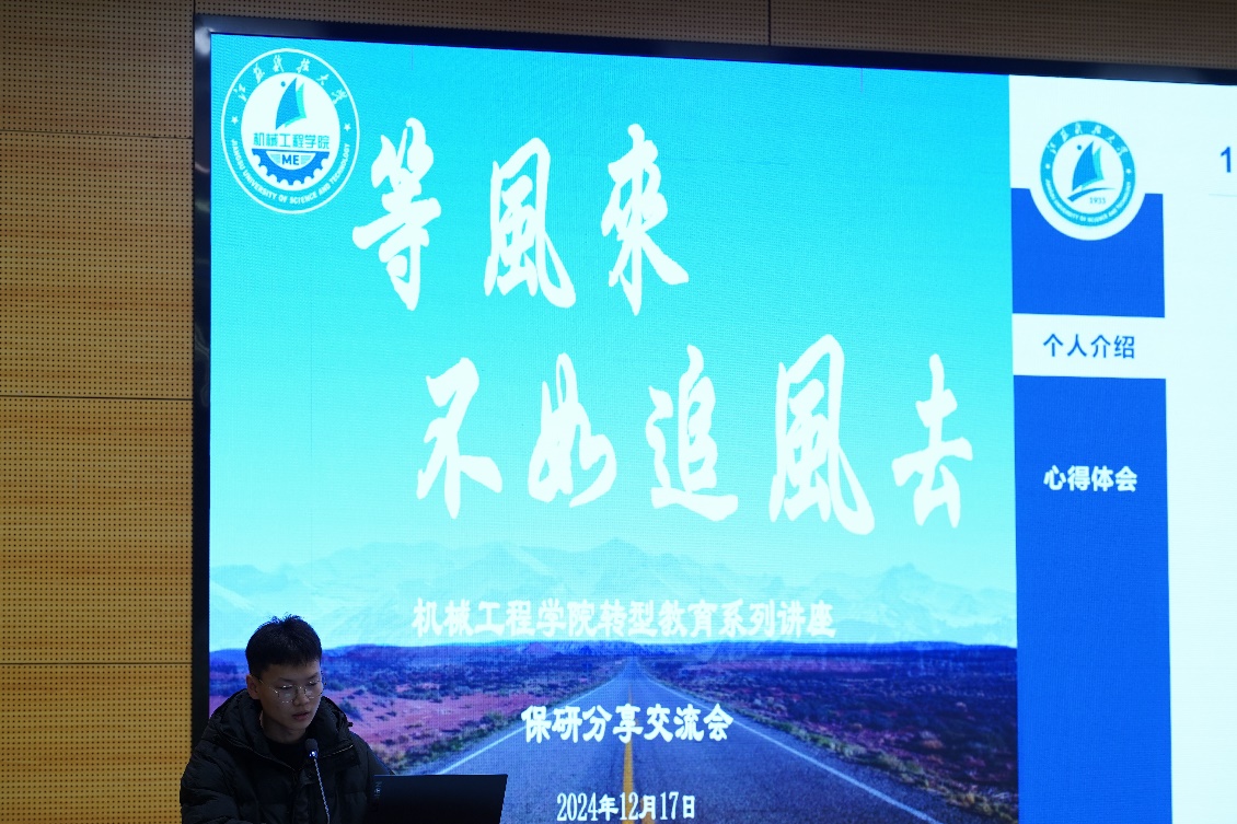 来自21级机械电子工程专业的薛伟重点从自己的竞赛经历、时间规划做了简要分享,他告诫学弟学妹们若有保研想法应在大一阶段打好基础、大二积极备战竞赛、大三争取有所产出。