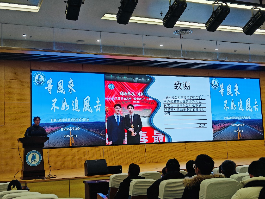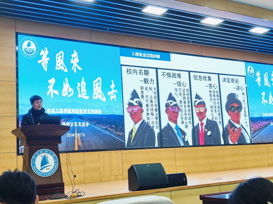 来自21级智能制造工程专业的王永康重点从预推免需要掌握的技能技巧、保研心态方面做了分享,他鼓励学弟学妹积极参加国家级赛事并勉励他们“越努力越幸运”。