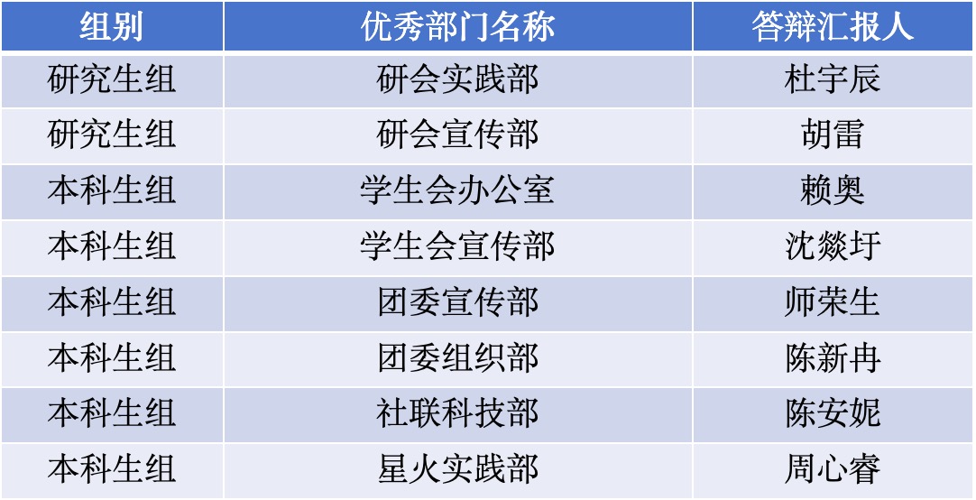 本次答辩会共有19个部门参与,从研究生组到本科生组,各部门负责人通过PPT的形式就过去一学期的工作成果进行了精彩展示与汇报。答辩现场,他们从员工工作出发,通过详实的数据、生动的案例,展示了一个学期以来部门在活动成果、团队建设、创新实践等方面的突出成绩。同时,各部门成员紧密配合,可以看到新鲜血液的加入为部门带来了更多的活力,彰显了团队的和谐氛围与开拓进取的精神风貌。