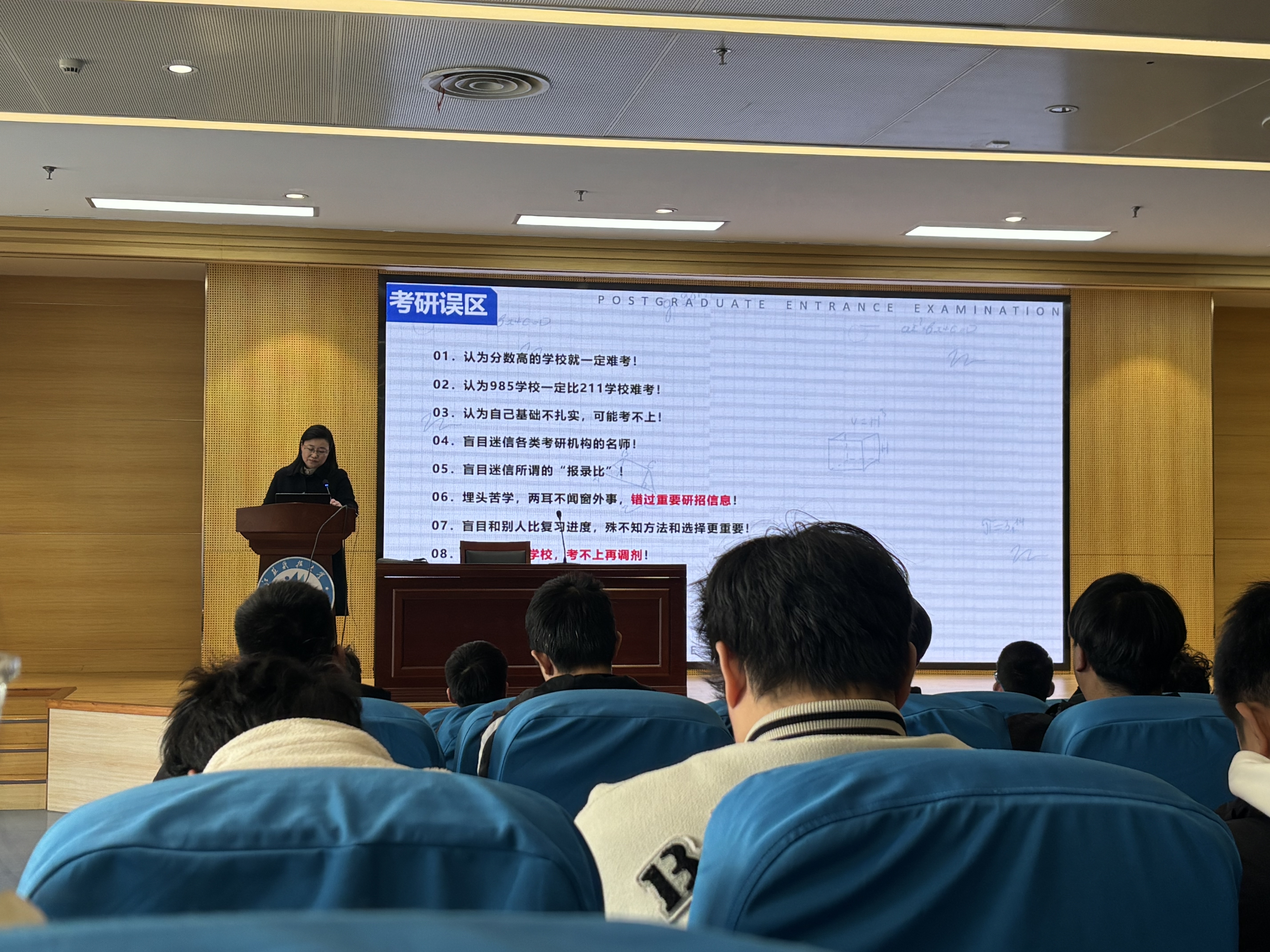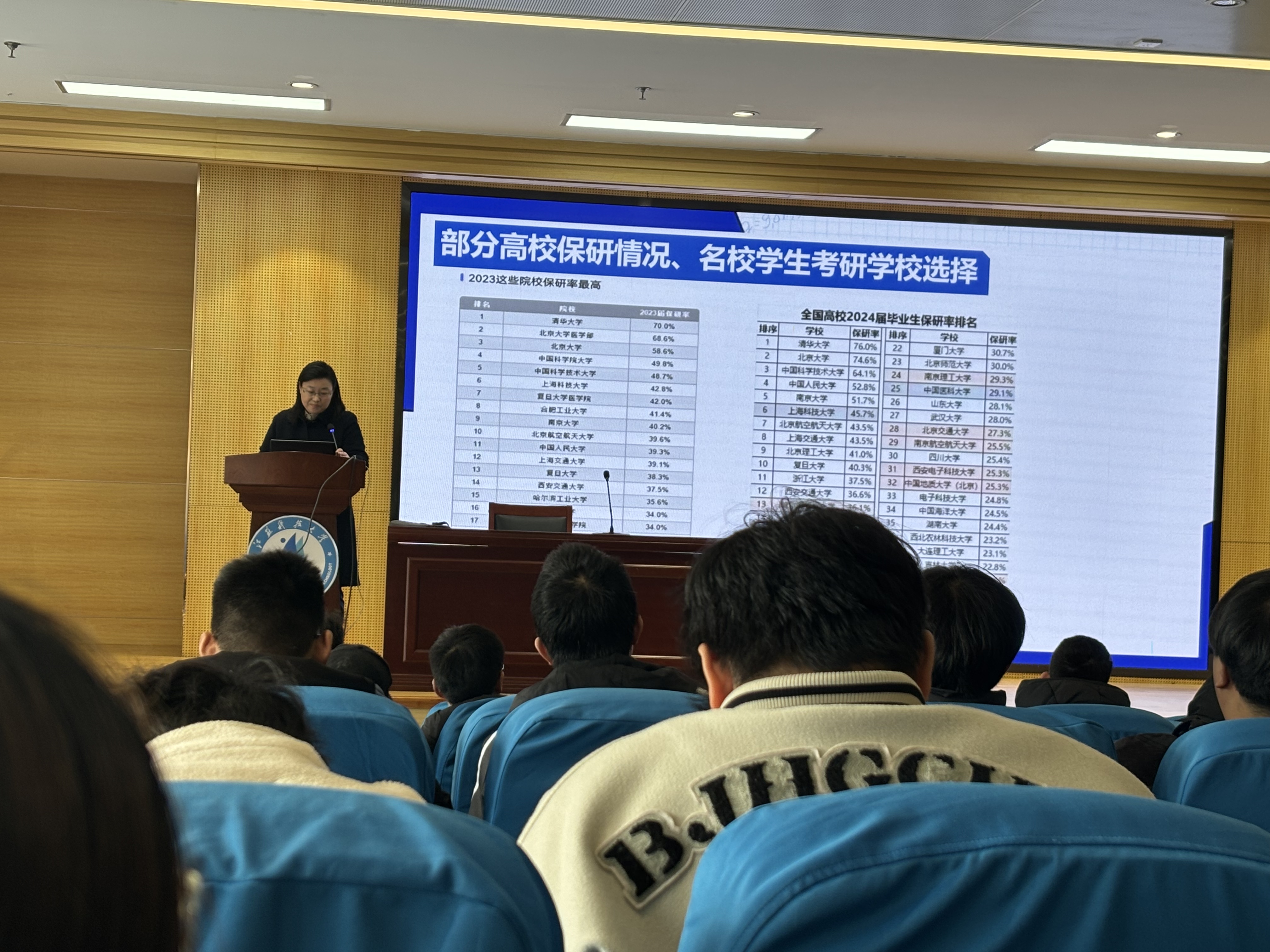 张黎明以“考研形势分析”为主题,表明研究生学历在岗位晋升、薪资待遇及科研资源获取上具有显著优势,尤其对技术研发类岗位而言,“学历是职业长期发展的‘加速器’”。结合企业招聘数据,她指出智能制造、机械与人工智能、材料科学的交叉学科等领域对硕士及以上学历的要求占比很大。此外,她通过软科学科排名数据的分析,提醒同学们在进行院校及专业选择是要综合考虑地域与行业联动、导团队源与培养模式、学科实力与科研平台等重要因素,既仰望星空又脚踏实地,选择最适合自己的院校专业。