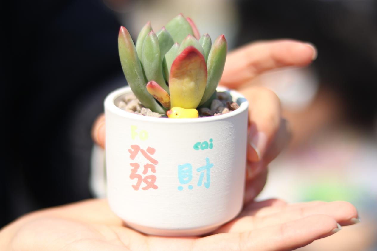活动现场,摆放着各式各样憨态可掬的多肉植物,肥厚的叶片饱满多汁,仿佛藏着整个春天的生机。旁边整齐排列的素色花盆,以及琳琅满目的DIY材料,如颜料、画笔、彩色贴纸、小装饰等,瞬间点燃了同学们的创作热情。