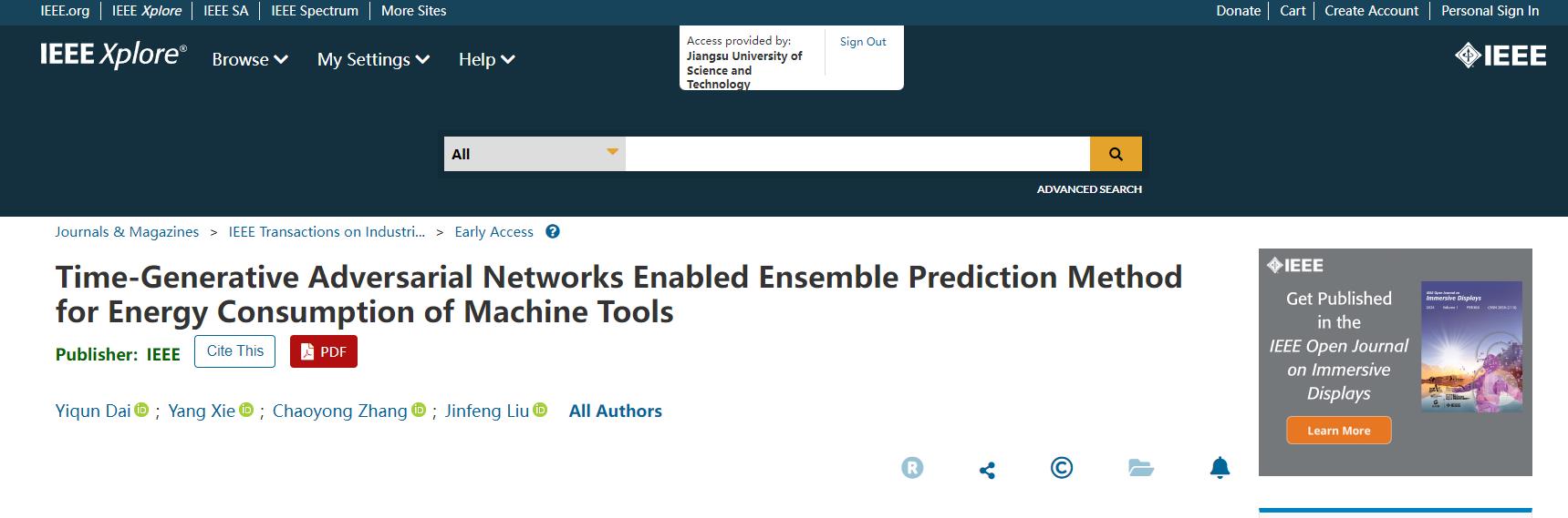 近日,太阳集团tyc33455官网船舶与海工装备智能制造团队22 级硕士研究生戴逸群在国际工业信息领域的顶级期刊IEEE Transactions on Industrial Informatics(影响因子11.7,中科院一区TOP)上以第一作者身份发表论文《Time-Generative Adversarial Networks Enabled Ensemble Prediction Method for Energy Consumption of Machine Tools》,太阳集团tyc33455官网谢阳老师为通讯作者。同时,针对数控加工能耗预测模型的对比研究,在国际环境工程顶级期刊Journal of Cleaner Production(影响因子9.8,中科院一区TOP),以谢阳老师第一,戴逸群第二作者身份发表论文《An integration model enabled deep learning for energy prediction of machine tools》。