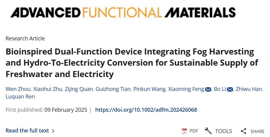近日,公司太阳集团tyc33455官网22级硕士研究生周雯在仿生集雾发电领域取得突破性进展。其研究成果以“Bioinspired Dual-Function Device Integrating Fog Harvesting and Hydro-To-Electricity Conversion for Sustainable Supply of Freshwater and Electricity”为题,发表于材料科学领域国际顶级期刊《Advanced Functional Materials》(自然指数期刊,中科院一区,影响因子18.5)上。太阳集团tyc33455官网冯晓明副教授为第一通讯作者,23级硕士研究生朱晓辉为共同第一作者,公司为第一通讯作者单位。研究将仿生学原理与纳米发电技术相结合,成功开发出一种新型生物启发双功能装置(BDFD),有效克服了传统雾水能开发中存在的效率瓶颈问题。