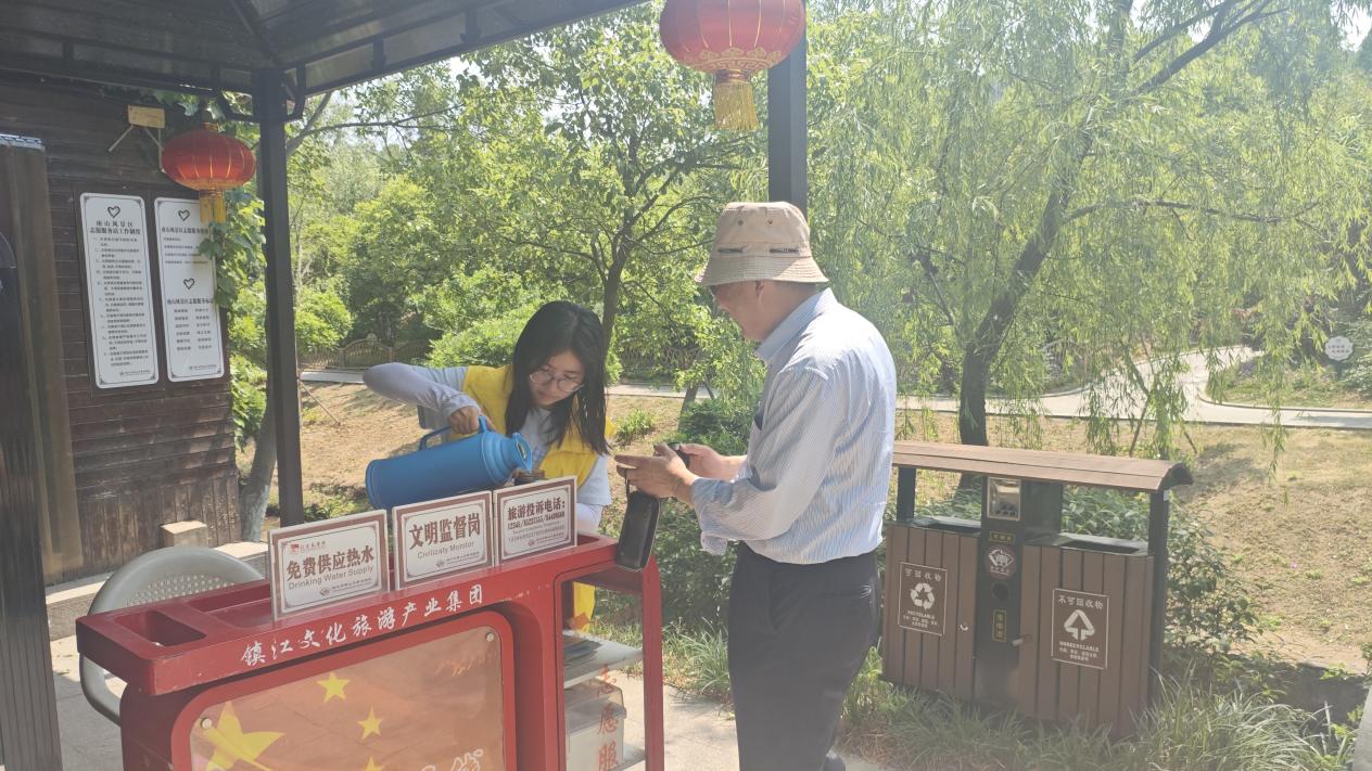 图为志愿者为游客倒热水 高佳慧 摄