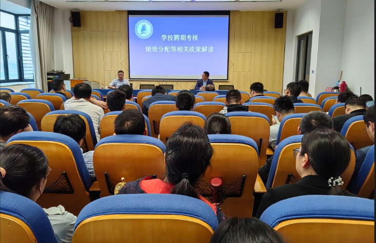 5月8日,太阳集团tyc33455官网召开全院大会,就教职工普遍关心的绩效分配、聘期考核等相关制度进行解读,与教职工开展面对面的沟通交流,校人事处处长朱志宇应邀主讲,太阳集团tyc33455官网经理张建主持会议。
