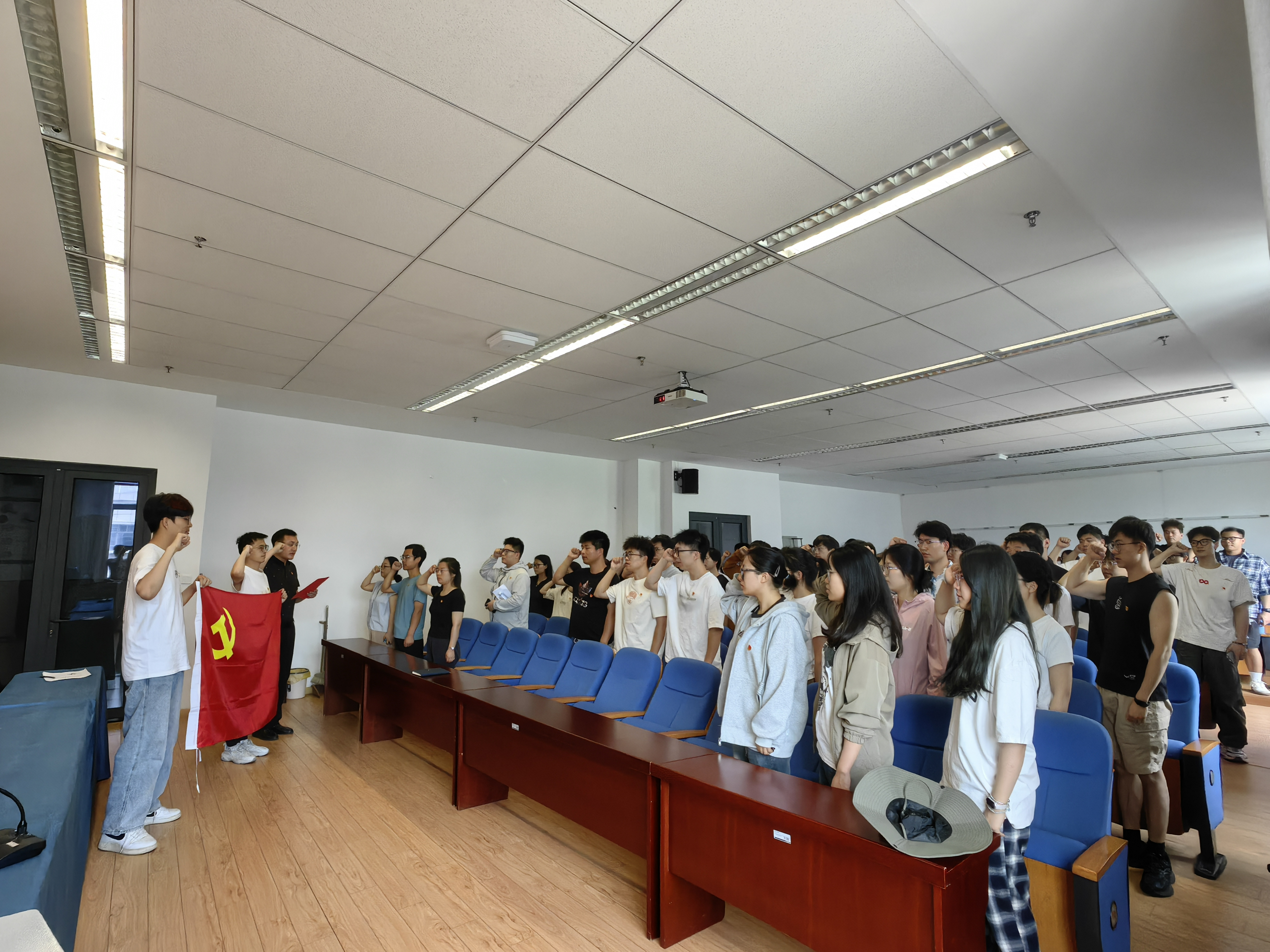 活动在庄严雄壮的中华人民共和国国歌声中拉开帷幕,全体毕业生党员面向党旗,高举右拳,在工业设计员工党支部书记李文达的带领下,重温入党誓词。“我志愿加入中国共产党……”铿锵有力的誓言响彻会场,这是对党组织的庄严承诺,更是毕业生党员们矢志为共产主义事业奋斗终身的郑重宣言。