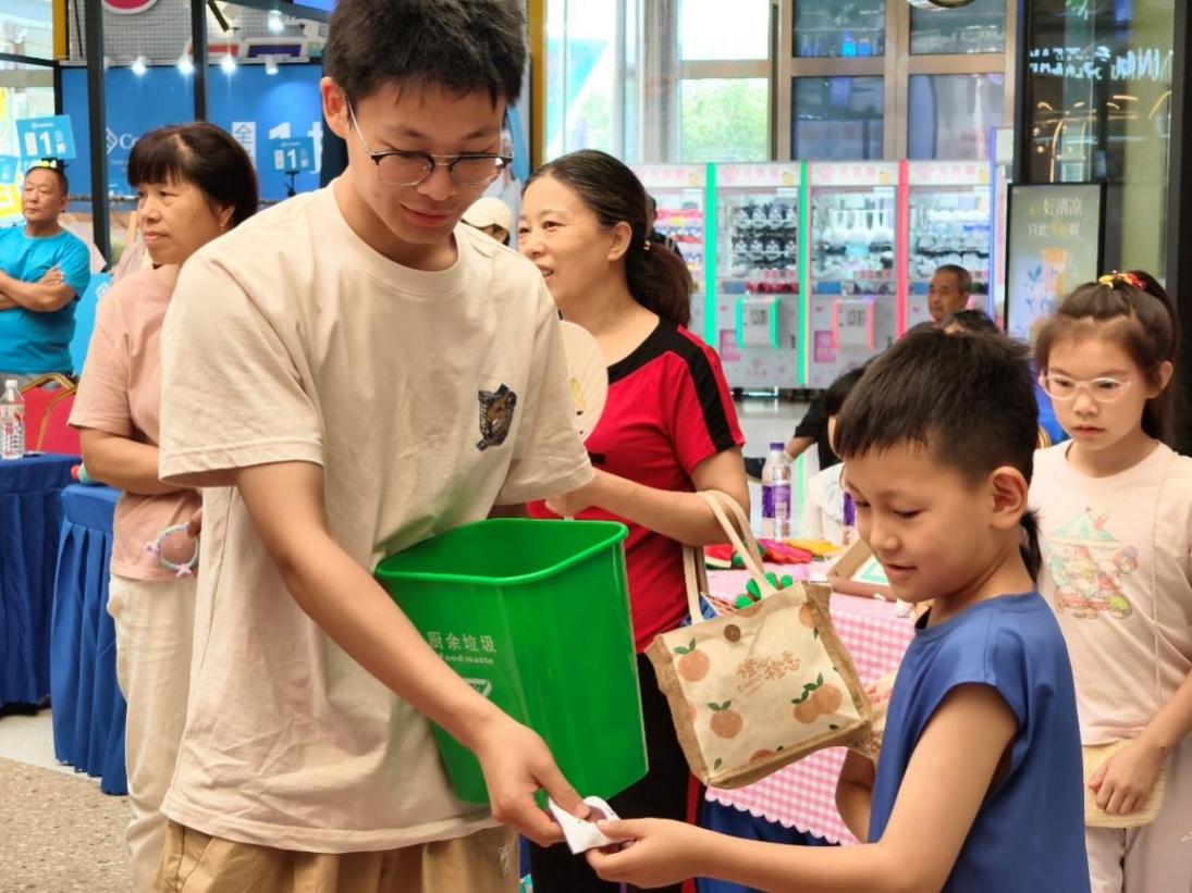 实践团成员们在手工体验区带领孩子们制作手工,耐心的指导孩子们制作手工帽子;在环保小游戏中,成员们将写有垃圾名称的小沙袋交给孩子们,再由孩子们将它们投入垃圾袋里,如果孩子们将垃圾分类正确则可以获得一份小礼品。