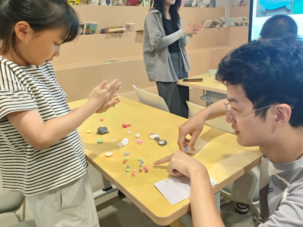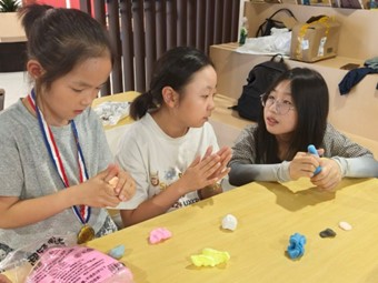 图为韩国同学和小朋友们用粘土捏江豚