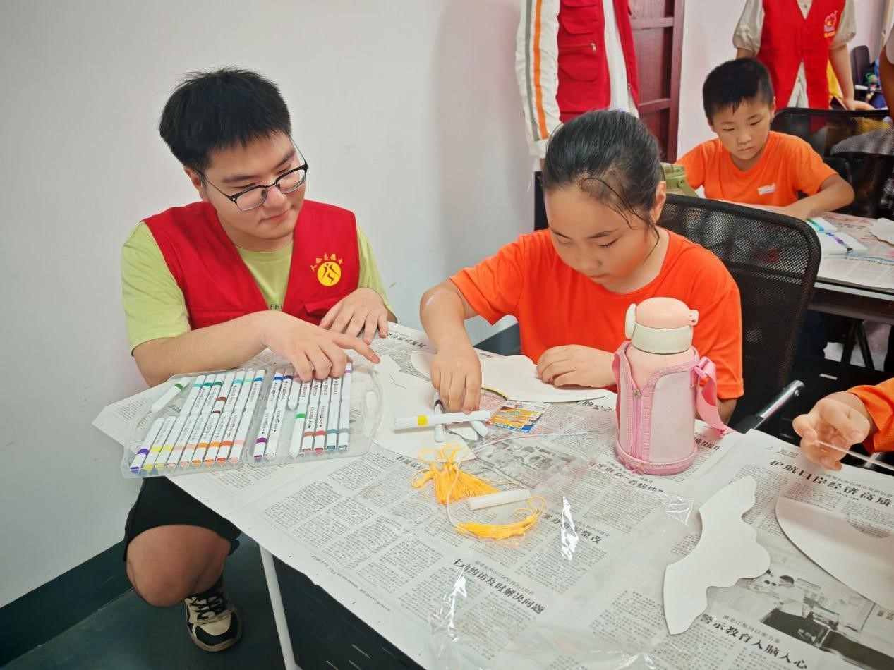 图为志愿者指导小朋友制作云肩 杨帅 摄